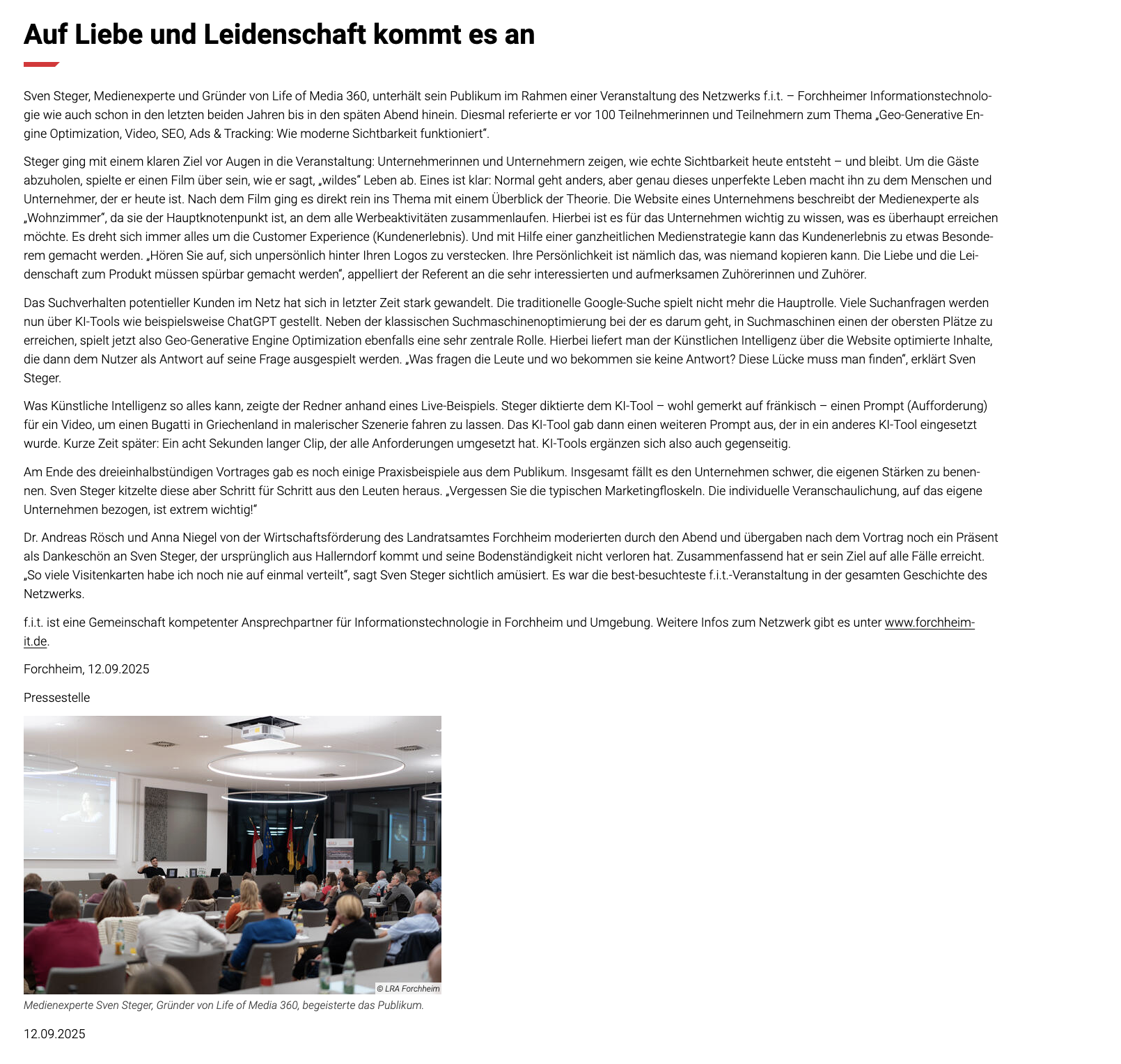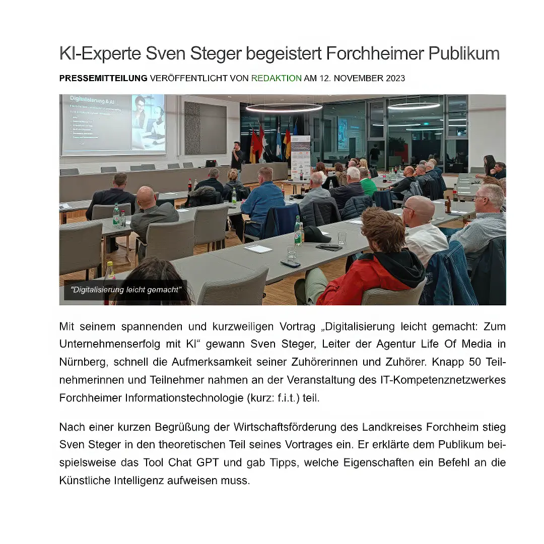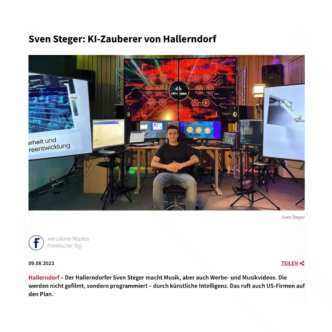 Denn sie drehen nicht einfach nur Videos, gestalten Websites oder posten Inhalte.Sie erzählen Geschichten, die unter die Haut gehen. Sie verbinden Filmkunst, KI-Power und digitale Strategien zu Bildern und Kampagnen, die bleiben. Dahinter steht Sven Steger – Gründer, Visionär, kreativer Kopf. Ein Typ, der schon Bands wie Limp Bizkit oder US-Fernsehpreisträger filmisch begleitet, internationale Awards gewonnen und mit seinem Team von Franken bis Las Vegas gearbeitet hat. Ganz nach dem Motto: Act Local, Think Global.